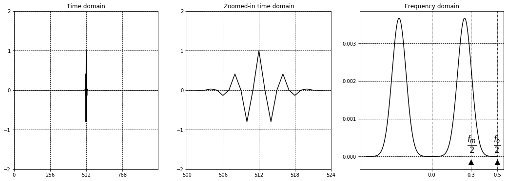 In the original frequency plot (c), we have non-zero values in the range [0.0, 0.02], denoted by the two ▲s. This range is called the bandwidth of the original signal (Remember that we only look at the positive frequencies [0.0, 0.5], because of the aforementioned symmetry in the negative frequencies.)