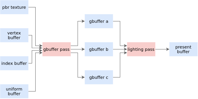 Side-note: I had an idea of using Rust’s async/await features to build a render graph. Since that feature also internally builds a directed graph, there is some semantic overlap. I asked around, and found out that there already was a working implementation of this idea! rendertoy by Tomasz Stachowiak. After going through the code, I decided that the complexity of async/await wasn’t worth it for me, for this project.