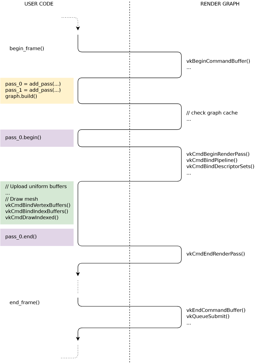 Pipeline barriers also may get inserted here.end_frame() ends the command buffer and sends